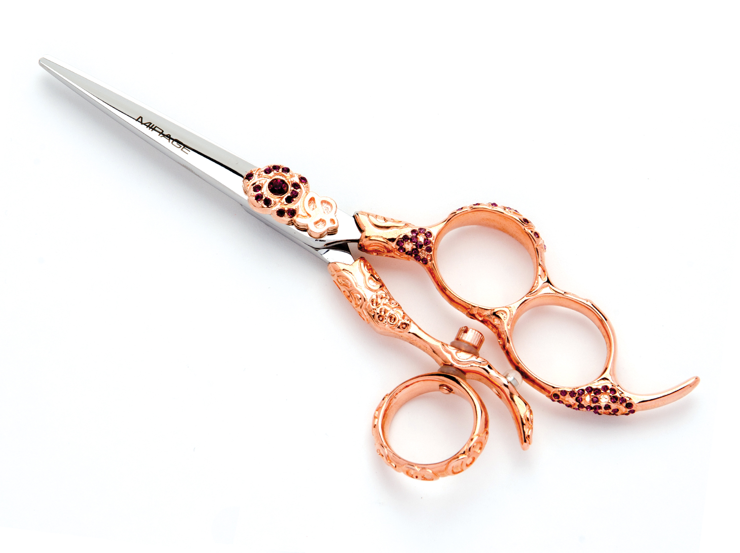 The Mirage Nirvana is a GORGEOUS, high quality hair shear with a rose gold handle and purple rhinestones arranged in a floral, henna pattern – looks beautiful and cuts effortlessly.