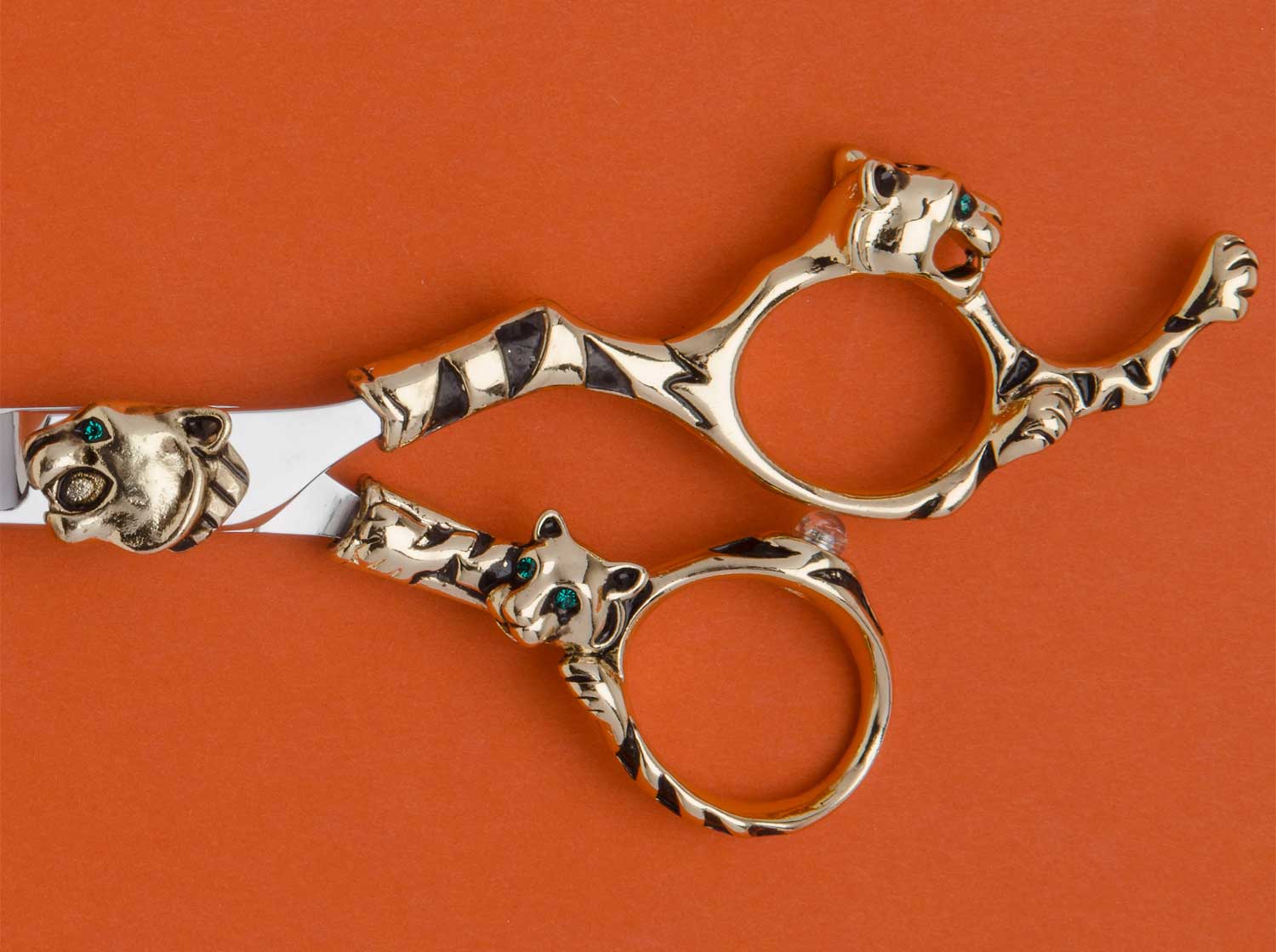 The Mirage Tiger hair cutting shear features three fierce tiger heads with green diamond eyes on the handle.