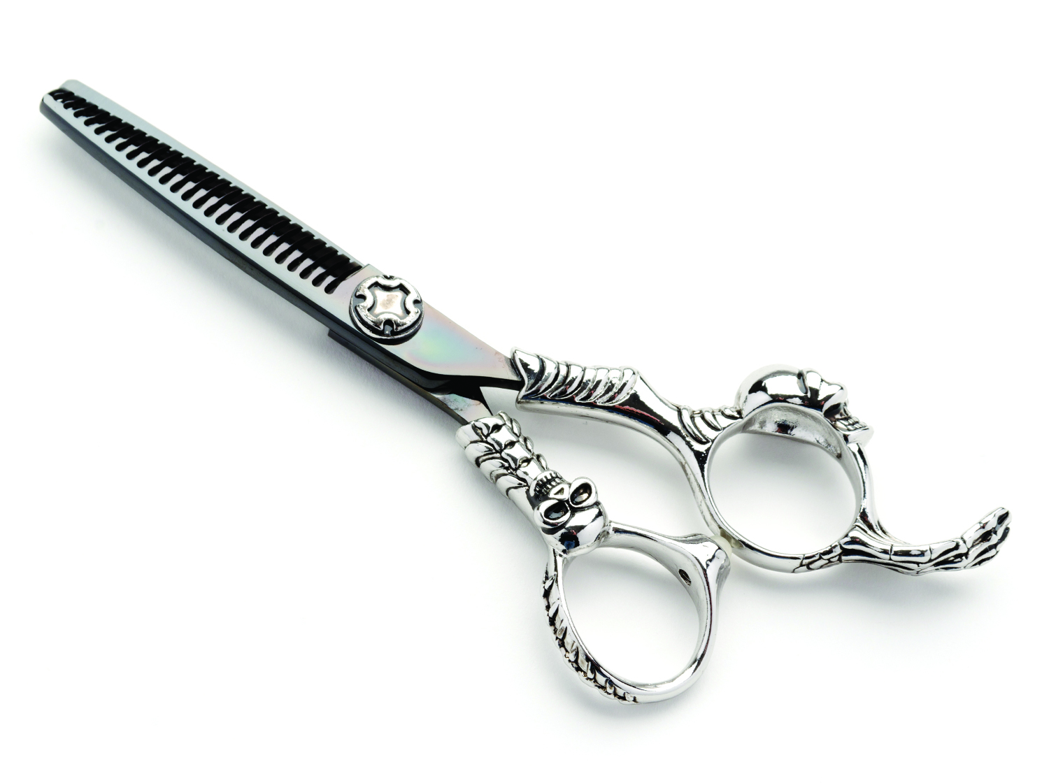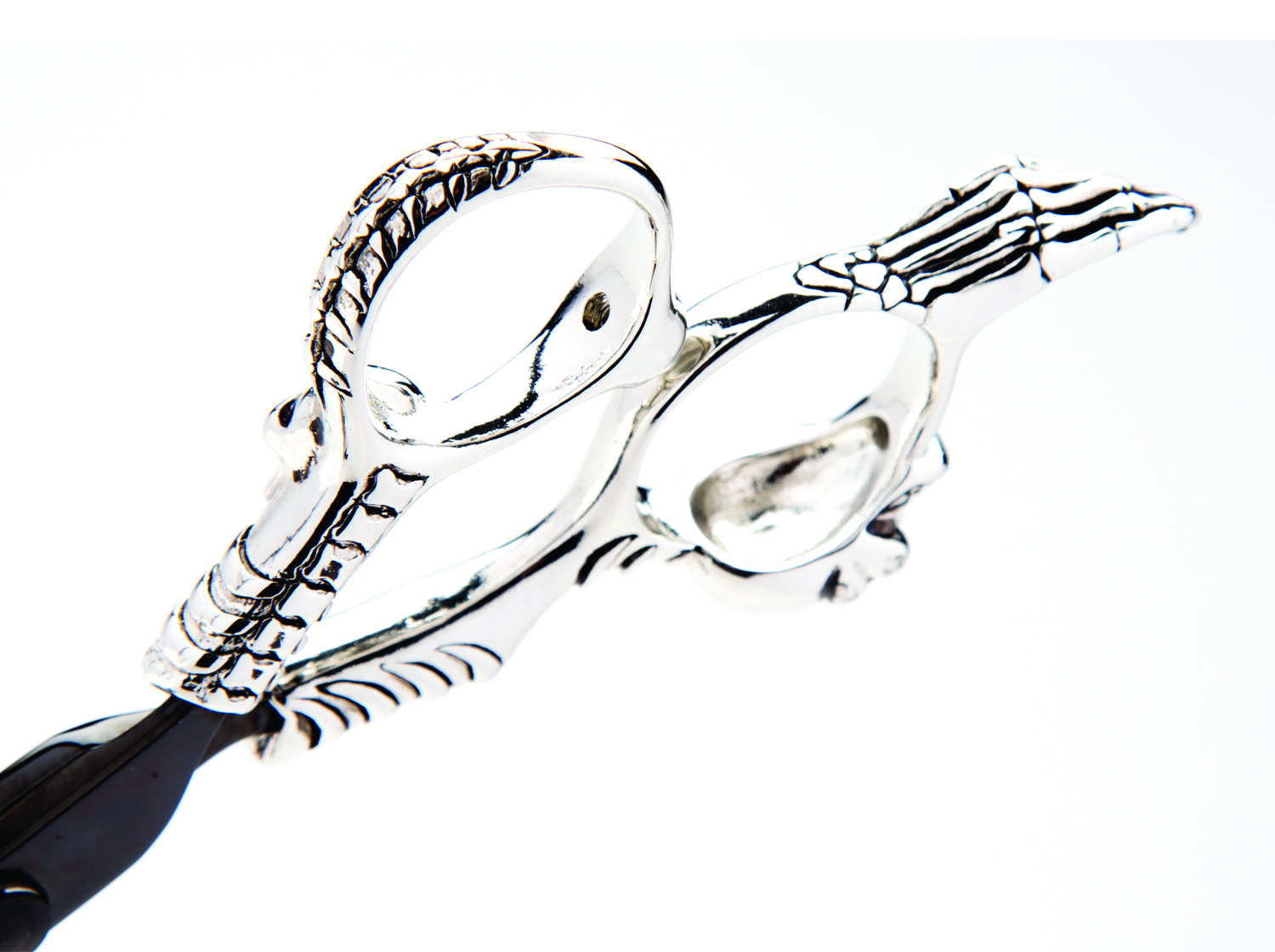 Finger rest is a skeleton hand that is EXTREMELY comfortable – perfect shear for gothic, punk stylist