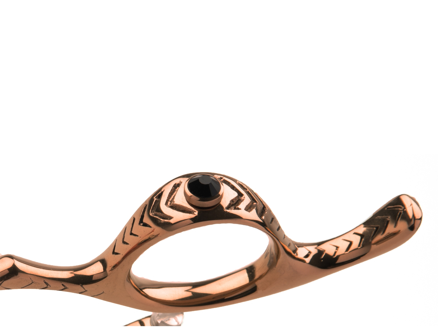 Beautiful gold bronze titanium coating, chevrons engraved on the handle with black crystal on top of the finger hole