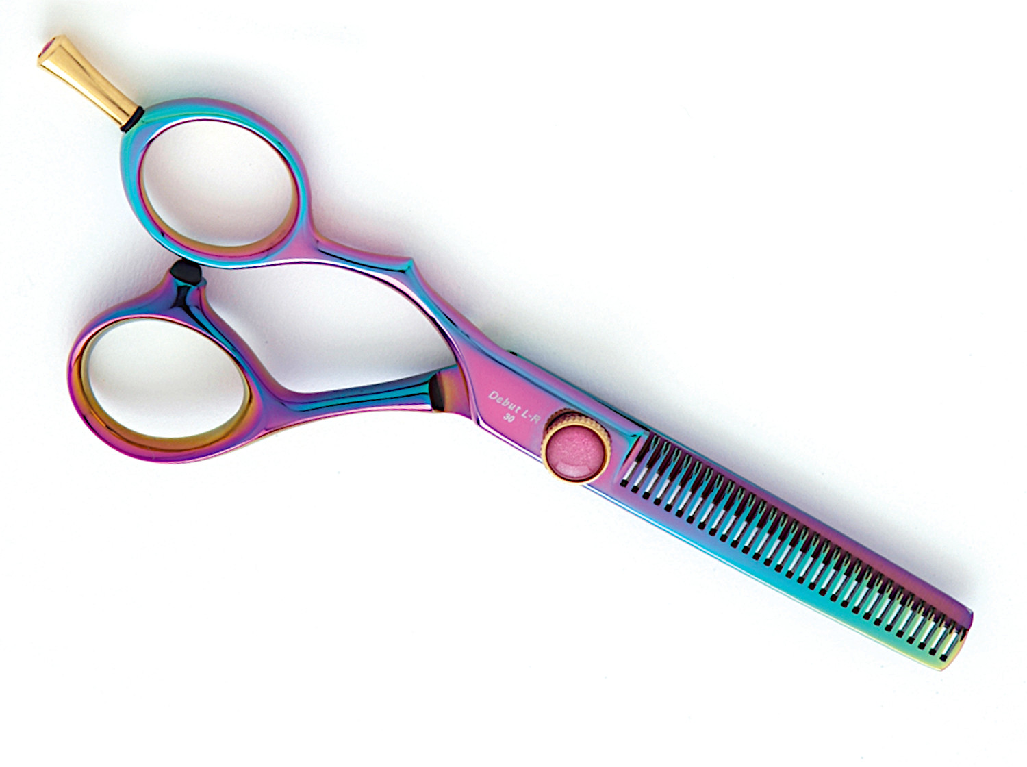 The Debut L-R 30 teeth thinner is a true left handed thinner that blends and thins your client’s hair.
